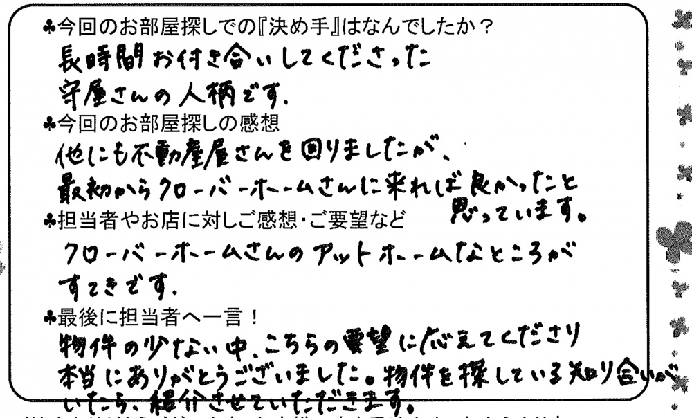 相模原の賃貸はクローバーホーム > お客様の声一覧 > 相模原市南区でご契約のA・Yさん