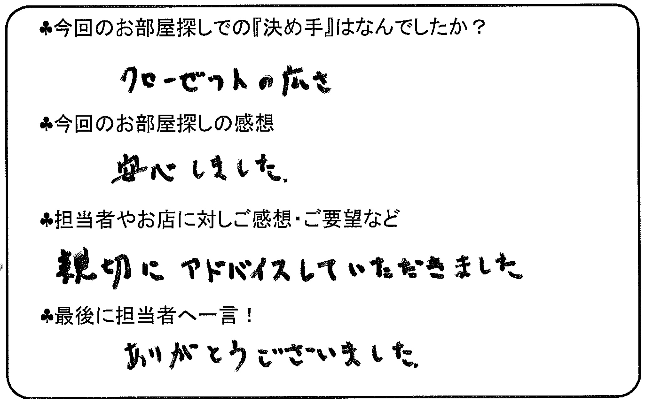 相模原の賃貸はクローバーホーム > お客様の声一覧 > 相模原市南区でご契約のA・Sさん
