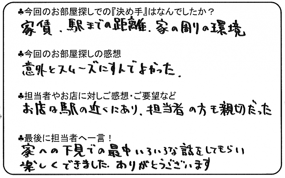 相模原の賃貸はクローバーホーム > お客様の声一覧 > 横浜市瀬谷区でご契約のT・Nさん